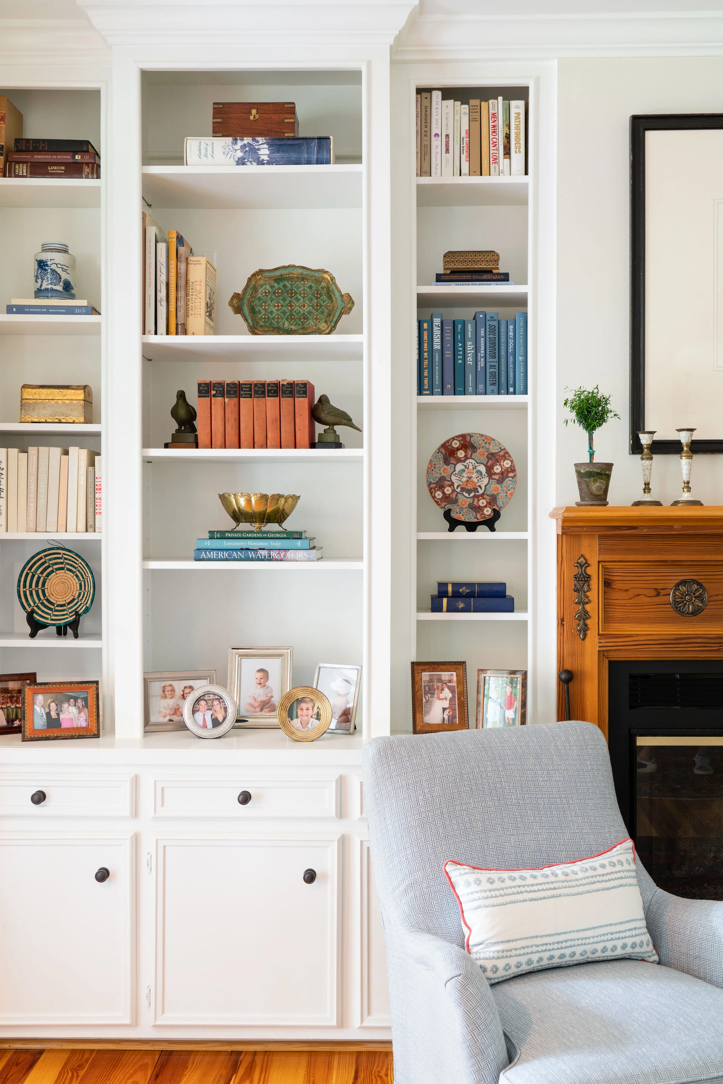 A white built-in bookshelf filled with books, decorative plates and frames, next to a wooden fireplace mantle with vintage candlesticks and a potted plant, partially visible gray armchair with a decorative pillow.