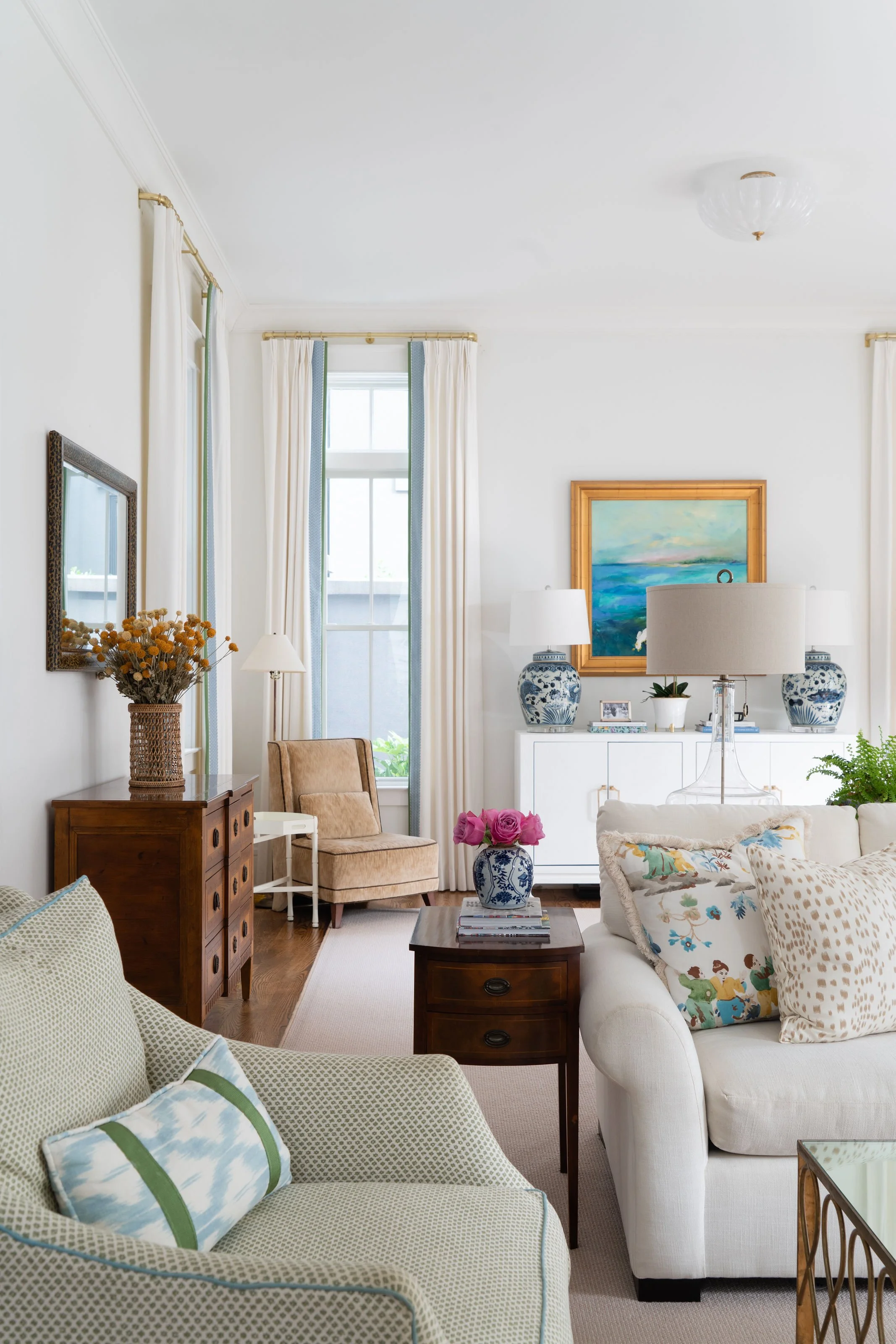 Bright living room with white walls, large windows with white and blue curtains, and a mix of modern and vintage furniture including cream and burnt orange sofas, a wooden coffee table, a beige armchair, and various blue and white decorative vases an
